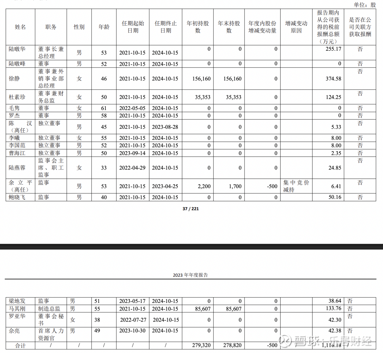 2023年,牧高笛董监高合计报酬增至1116.18万元。其中,陆暾华报酬涨至255.17万元,徐静报酬涨至374.58万元,杜素珍报酬涨至124.25万元,马其刚报酬涨至133.76万元。