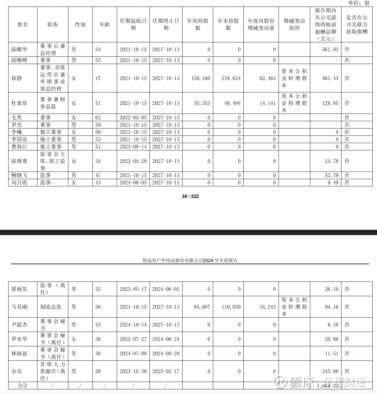 2024年,牧高笛董监高合计报酬进一步升至1669.78万元。其中,陆暾华报酬涨至561.93万元,徐静报酬涨至461.44万元,杜素珍报酬涨至128.85万元。但是马其刚薪酬则下降至94.16万元。