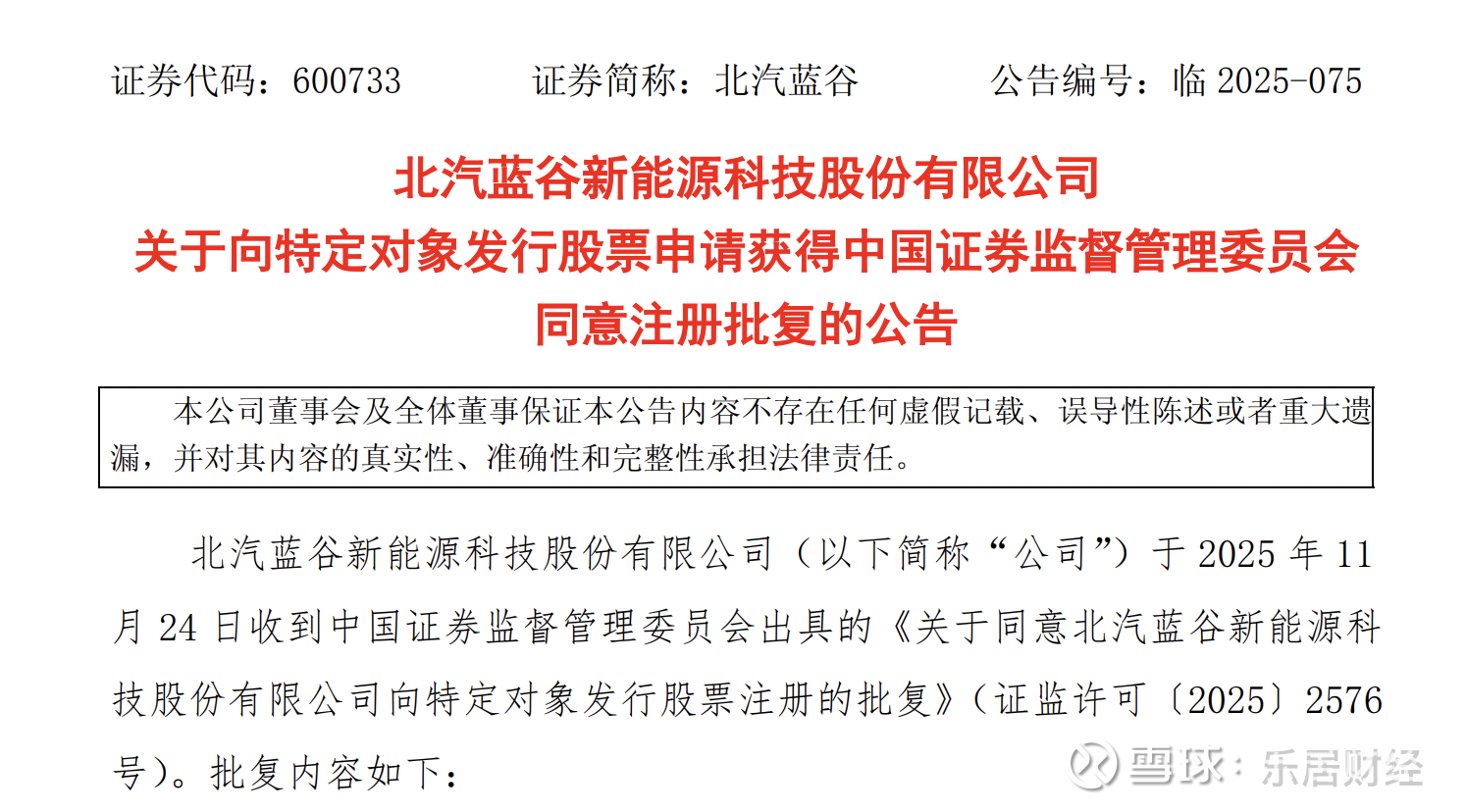 瑞财经 刘治颖11月25日,北汽蓝谷(SH600733)公告,其向特定对象发行股票的注册申请已获得中国证券监督管理委员会批复通过。该批复文件于2025年11月24日正式送达,相关申请已于11月20日注册生效。