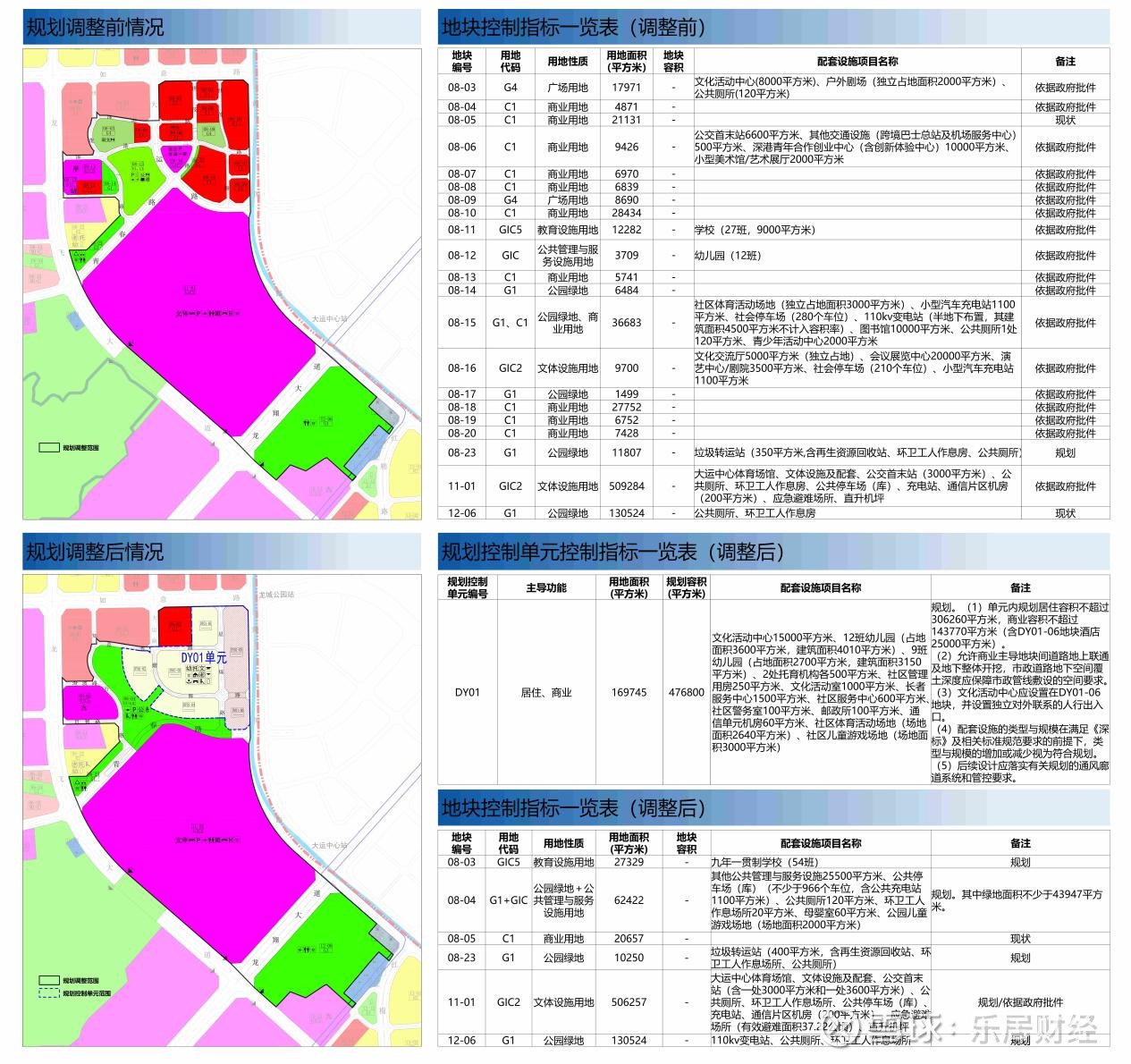 根据调整,DY01规划控制单元地块调整后主导功能为居住、商业,用地面积169745平方米,规划容积476800平方米。该单元内规划居住容积不超过306260平方米,商业容积不超过143770平方米。