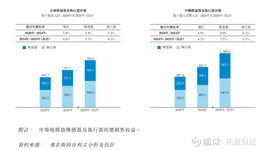 全球与中国的传感器市场持续增长,规模分别由2020年的约1,891亿美元及人民币2,929亿元扩大至2024年的2,371亿美元及人民币3,983亿元,复合年增长率分别约为5.8%及8.0%。于同期,全球与中国的执行器市场规模,亦分别由2,621亿美元及人民币3,945亿元增长至3,205亿美元及人民币4,991亿元,复合年增长率分别约5.2%及6.1%。