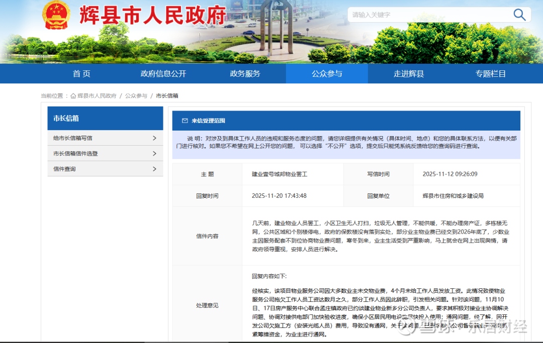 几天后,11月20日,辉县市住房和城乡建设局对此回复市民,公开信揭开的调查结果更令人震惊——该项目物业服务公司因大多数业主未交物业费,4个月未给工作人员发放工资,导致工作人员辞职,服务停摆。