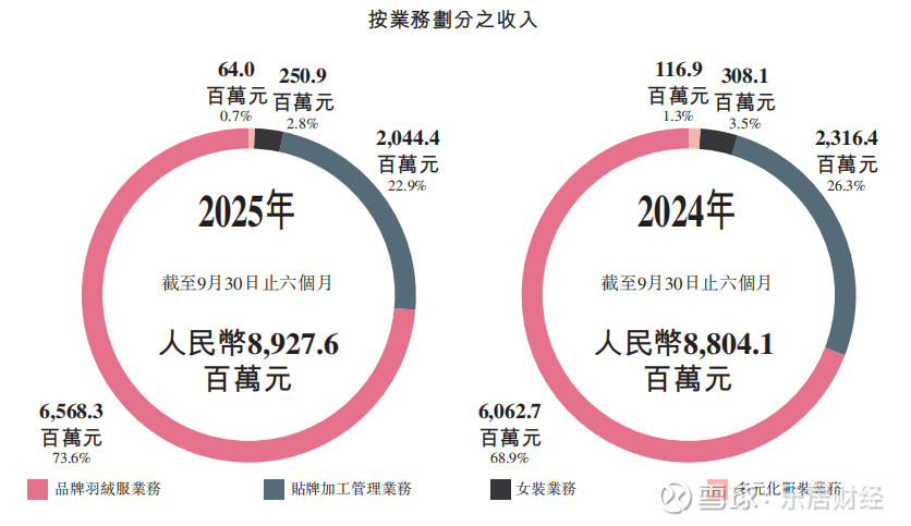 羽绒服业务中,波司登品牌收入在上半财年同比上升8.3%达57.19亿元,占羽绒服业务的87.1%;雪中飞品牌收入约为3.78亿元,同比小幅下降3.2%。
