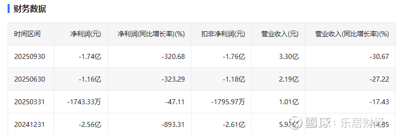 2025年三季报显示,公司前三季度营业收入仅为3.3亿元,同比下降30.67%;归母净利润亏损扩大至1.74亿元,同比下降320.68%。