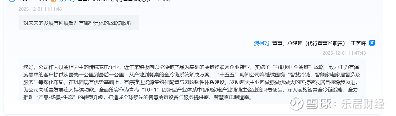 他指出,“十五五”期间公司将继续围绕“智慧冷链、智能家电家居智造及服务”等深化布局,在巩固现有优势基础上,有序推进资源集约化配置与风险韧性体系建设,驱动两大主业向做强做优做大的可持续发展目标稳步迈进。