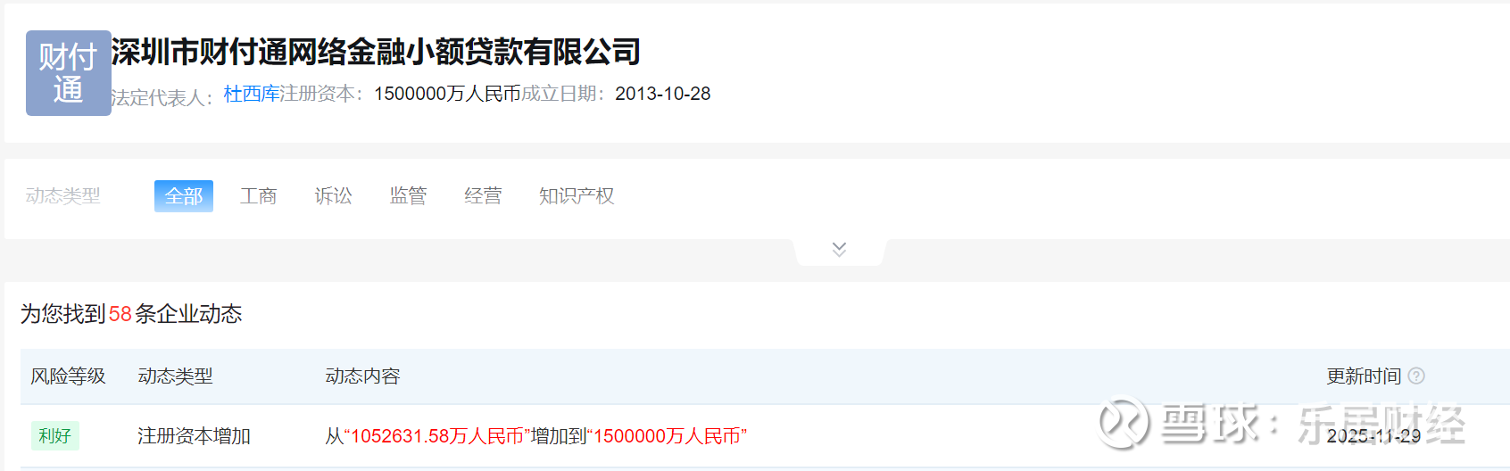 瑞财经 王敏11月29日,天眼查显示,财付通小贷关联公司深圳市财付通网络金融小额贷款有限公司发生工商变更,注册资本由约105.3亿元增至150亿元,增幅42.45%。