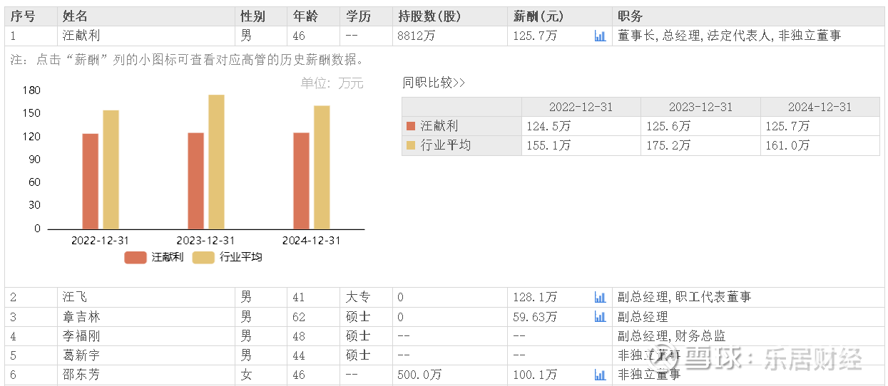 据东方财富网数据,永臻股份董事长兼总经理汪献利2024年所获薪酬为125.7万元,副总经理汪飞、董事邵东芳同年