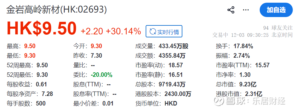 乐居财经 王敏12月3日,金岩高岭新材(HK:02693)在港交所挂牌上市,国元国际为独家保荐人,其开盘涨30%,总市值超9亿港元。