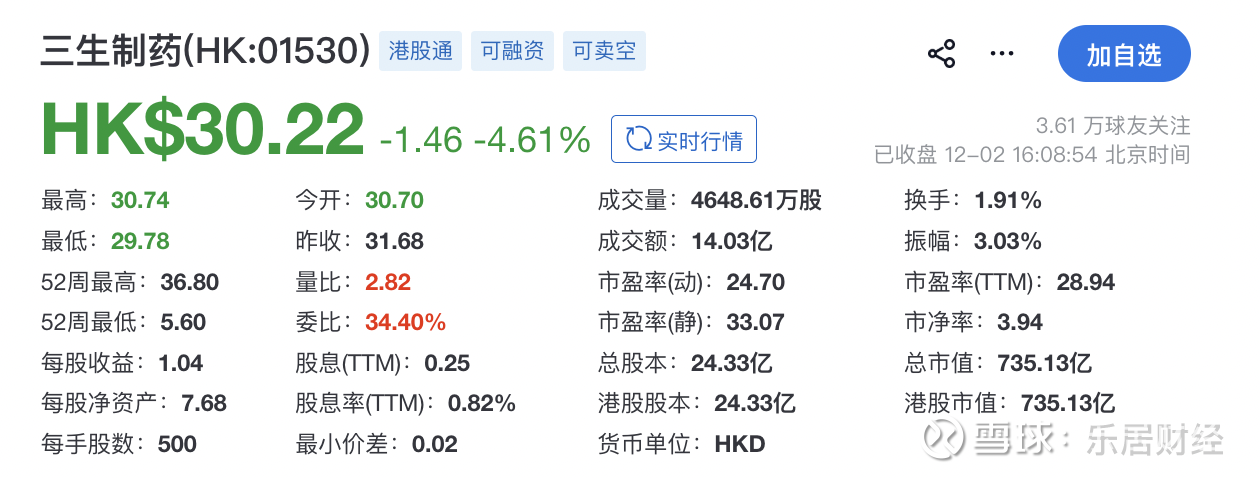 截至12月2日收盘,三生制药跌4.61%,报30.22港元,总市值为735.13亿港元。