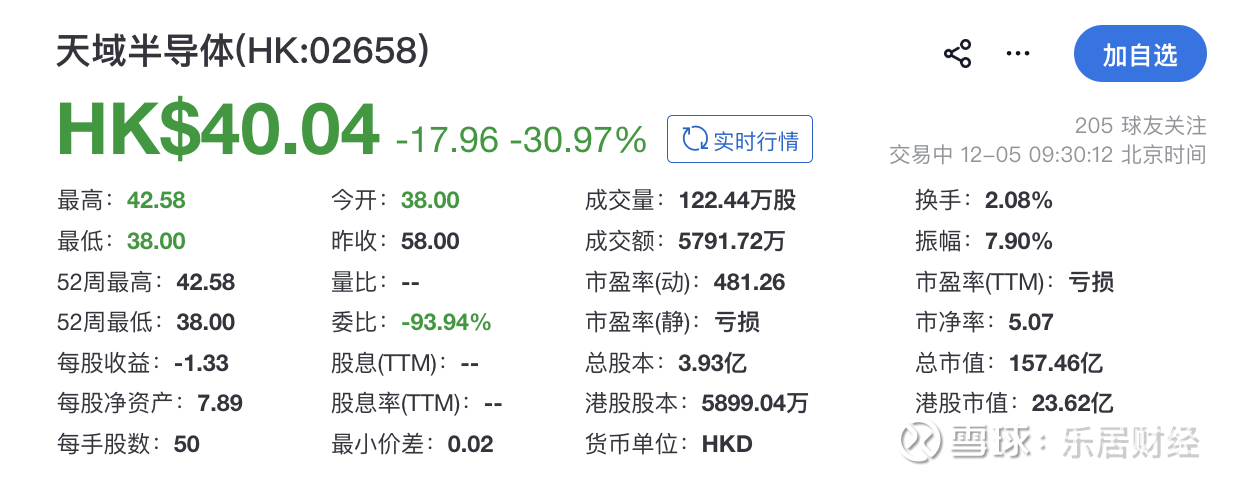 乐居财经 刘治颖12月5日,天域半导体(02658.HK)在港交所挂牌上市,独家保荐人为中信证券,开盘跌30.97%,总市值157.46亿港元。
