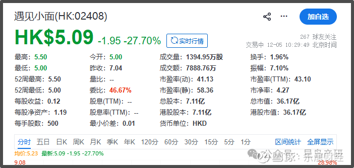 12月5日正式挂牌当天,遇见小面延续破发态势,以5港元/股开盘,此后便迅速跌超25%。截至5日上午10点30分,遇见小面股价报5.09港元/股,跌幅27.70%,总市值36.17亿港元。