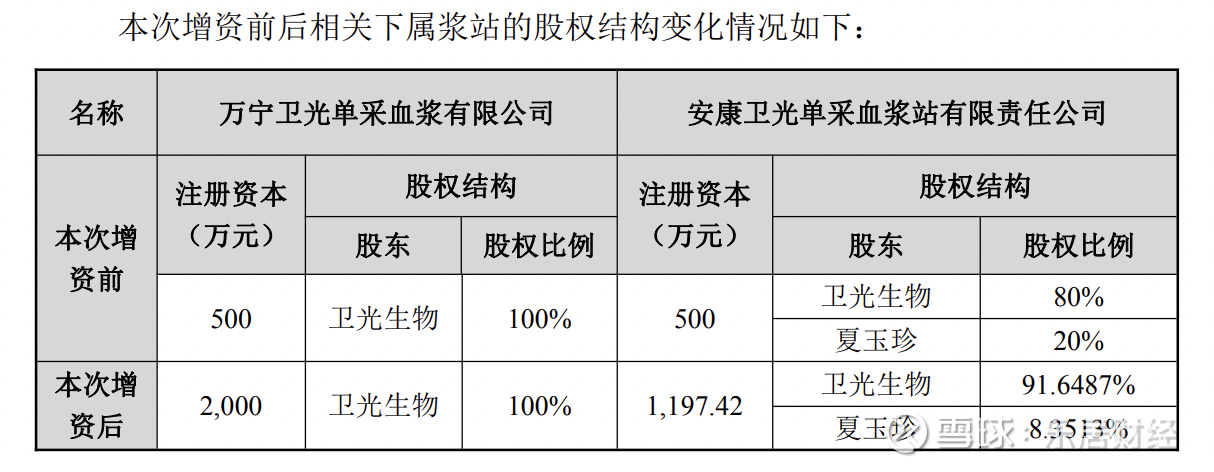 卫光生物持有安康浆站80%股权,剩余20%股权由夏玉珍持有。夏玉珍承诺自愿放弃本次增资安康浆站的权利,由卫光生物单独进行增资。增资后,安康浆站的注册资本将增至1197.42万元,由卫光生物持股91.65%。