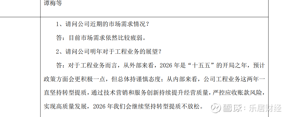 对于投资者关心的2026年工程业务展望,公司展现出谨慎态度。从内部来看,公司工程业务这两年一直坚持转型提质,通过技术营销和服务创新持续提升经营质量,严控应收账款风险,实现高质量发展,2026 年我们会继续坚持转型提质不放松。