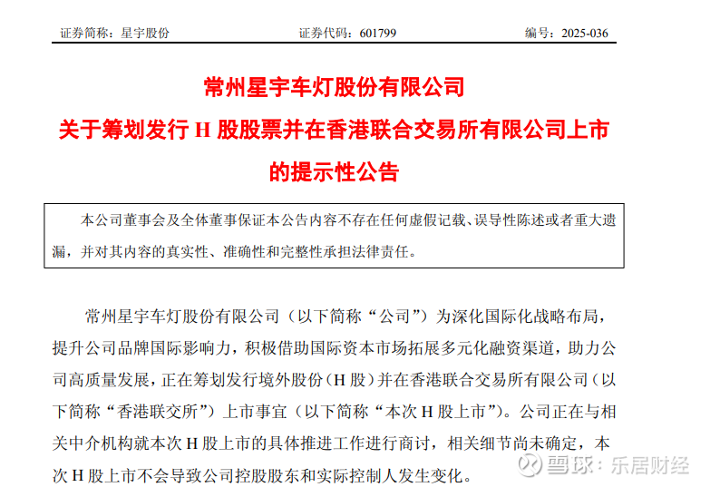乐居财经 李兰近日,星宇股份(601799.SH)发布公告,公司正在筹划发行境外股份(H 股)并在香港联交所上市事宜。