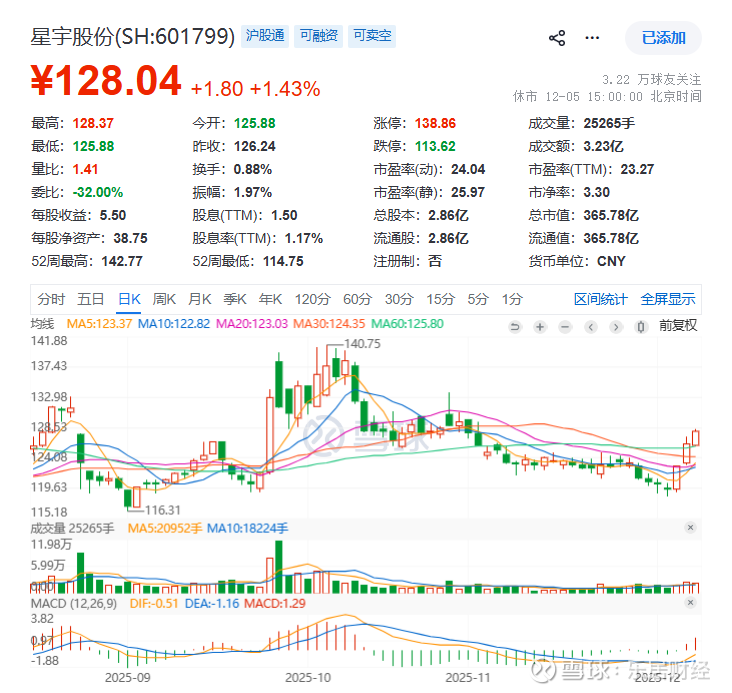 星宇股份于2011年在上海证券交易所上市。截至12月5日收盘,其总市值为365.78亿元。