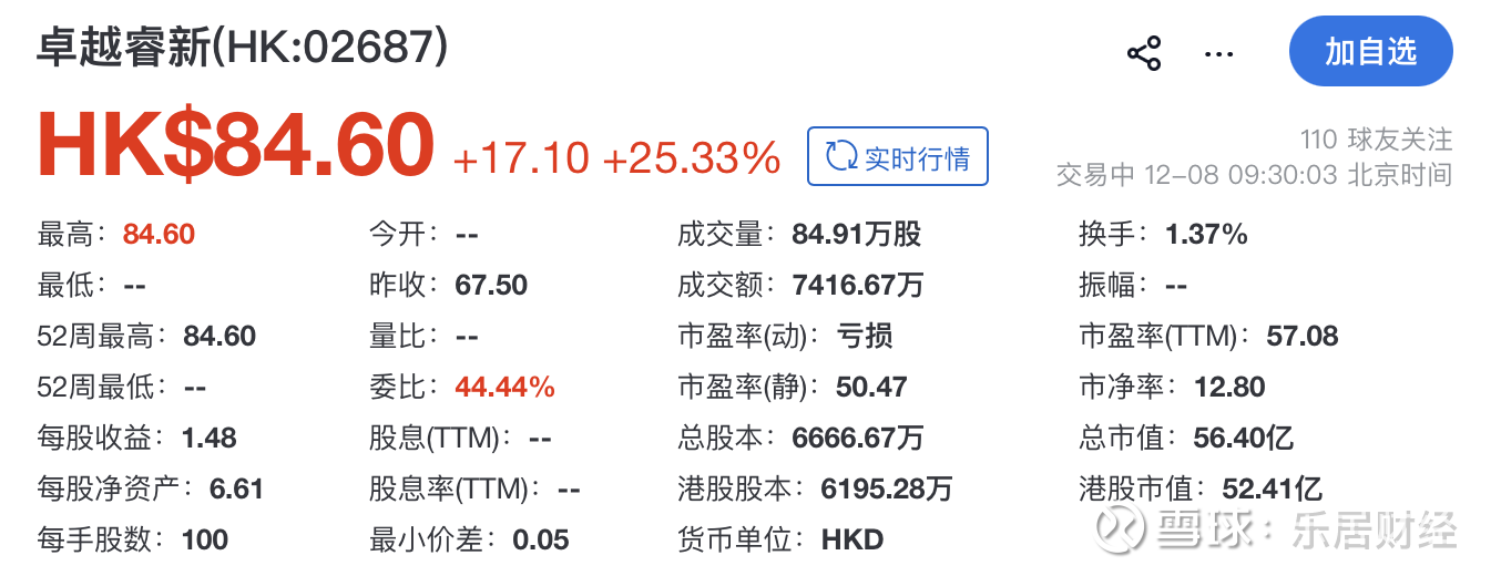 乐居财经 吴文婷 12月8日,卓越睿新(02687.HK)在港交所挂牌上市,农银国际为其独家保荐人。其开盘报84.6港元,涨25.33%,总市值约56.4亿港元。