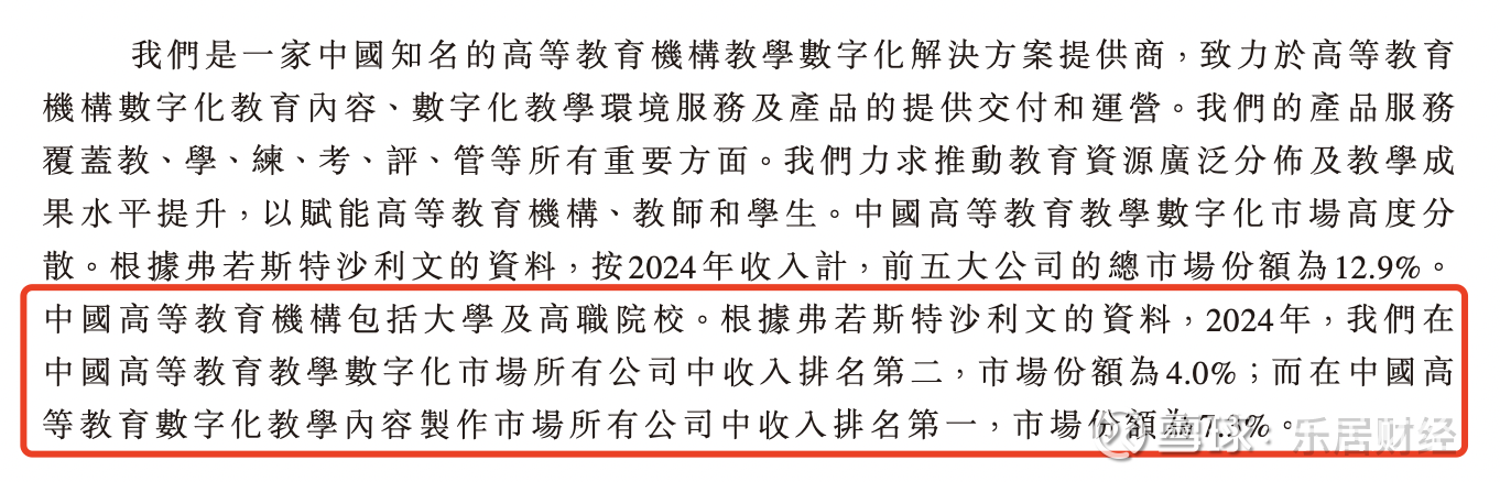 根据弗若斯特沙利文的资料,2024年,公司在中国高等教育教学数字化市场所有公司中收入排名第二,市场份额为4.0%;而在中国高等教育数字化教学内容制作市场所有公司中收入排名第一,市场份额为7.3%。