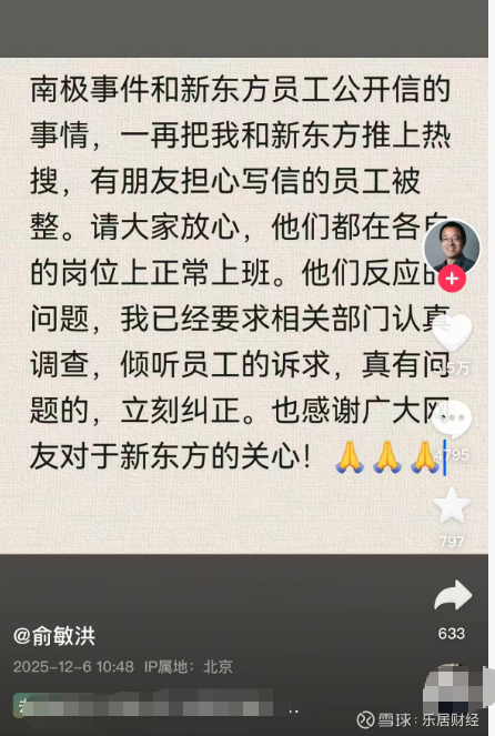 瑞财经 李兰12月6日,新东方创始人俞敏洪通过个人社交平台发文,回应近日引发关注的员工公开信事件。