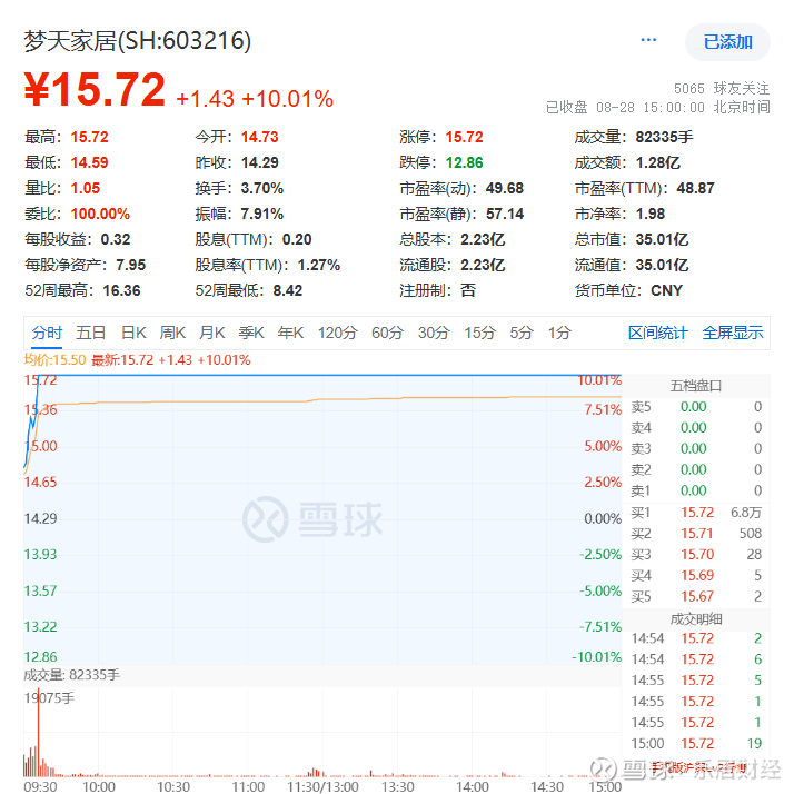 乐居财经 李兰 8月28日,梦天家居(603216.SH)收盘涨10.01%,报15.72元/股,总市值为35.01亿元。