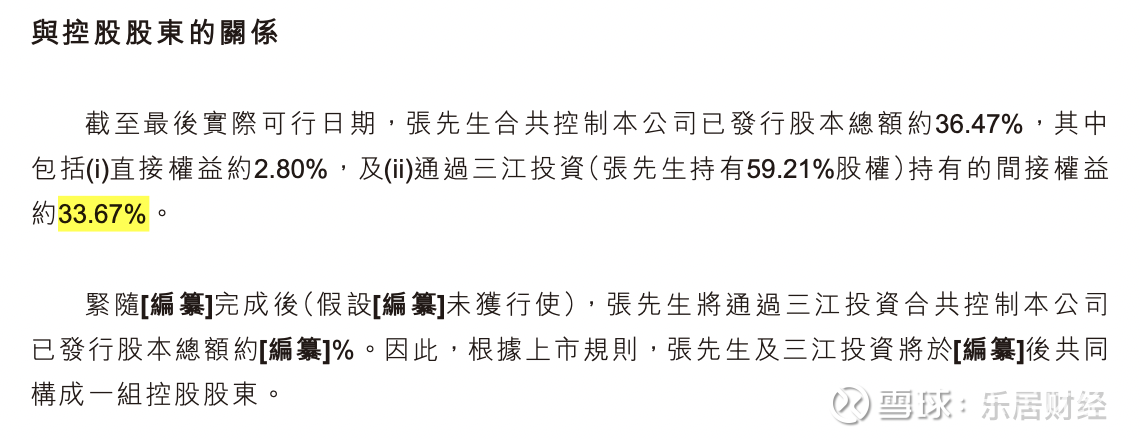 IPO前,张万镇合共控制公司已发行股本总额约36.47%,其中 包括直接权益约2.80%,及通过三江投资(张万镇持有59.21%股权)持有的间接权益约33.67%。