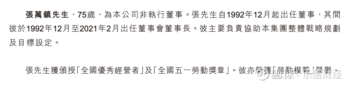 资料显示,张万镇,75岁,为公司非执行董事。张万镇自1992年12月起出任董事,其间于1992年12月至2021年2月出任董事会董事长。其主要负责协助集团整体战略规划及目标设定。
