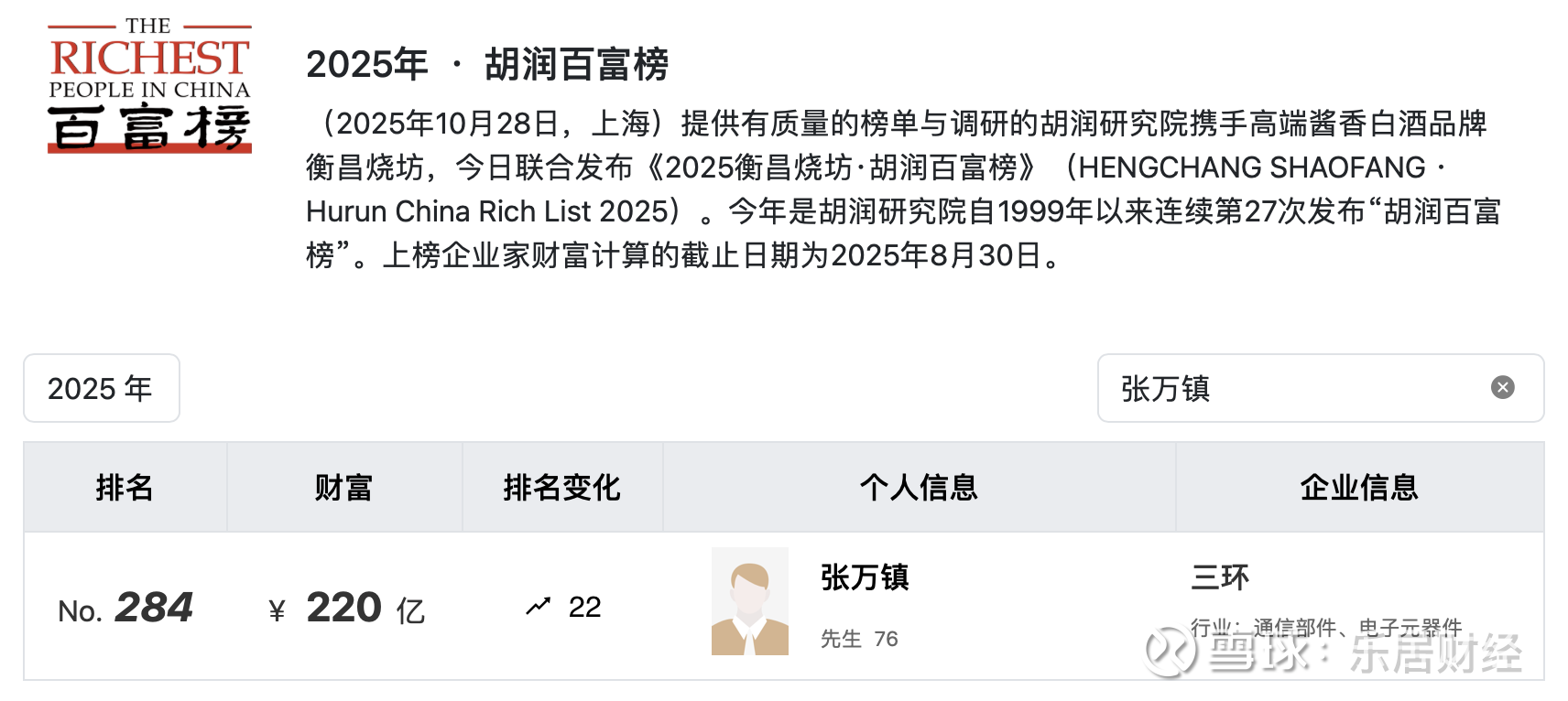 值得一提的是,今年10月28日,2025胡润百富榜发布,张万镇以220亿元财富位列榜单第284位,潮州第一。
