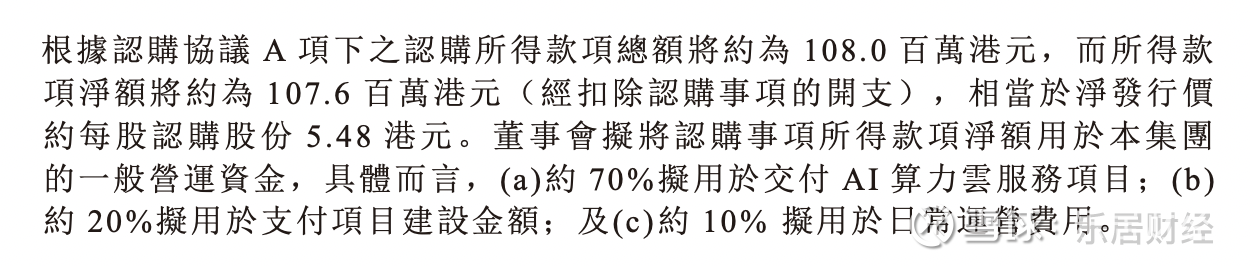 关于募资用途方面,约70%拟用于交付AI算力云服务项目;约20%拟用于支付项目建设金额;及约10%拟用于日常运营费用。