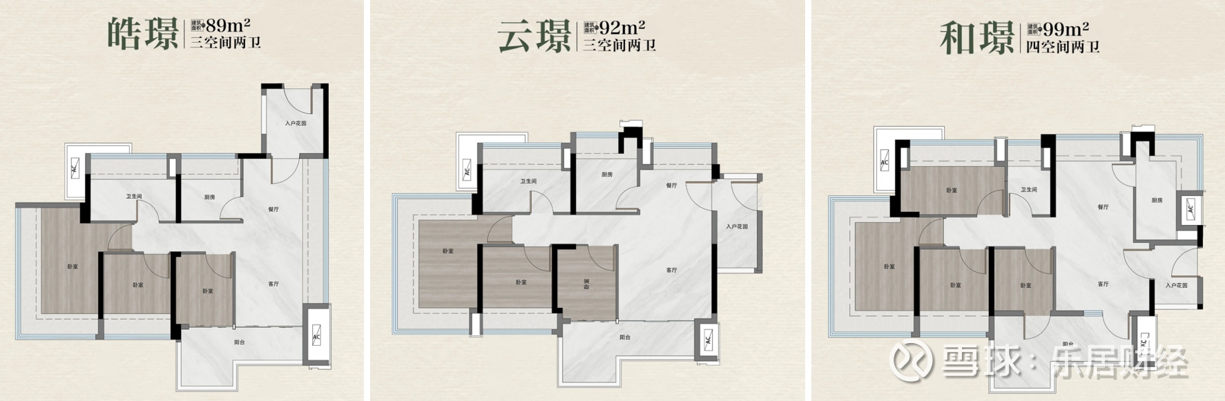89、92㎡为三房两卫,99㎡为四房两卫。