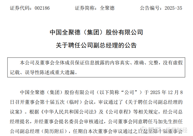 公告显示,中国全聚德(集团)股份有限公司当日召开董事会第十届五次(临时)会议,审议通过《关于聘任公司副总经理的议案》。经公司总经理提名、董事会提名委员会审核通过,公司董事会同意聘任马加担任公司副总经理,任期自本次董事会审议通过之日起至第十届董事会届满之日止。