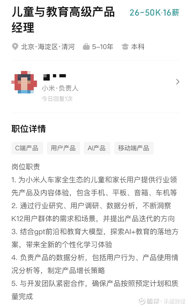 而儿童与教育高级产品经理一职则主要负责为小米人车家全生态的儿童和家长用户提供产品及内容体验,设备场景包含手机、平板、音箱、车机等;同时,需要结合GPT前沿和教育大模型,探索AI+教育的落地方案等。小米为该职位开出的薪酬同为26-50K*16薪。