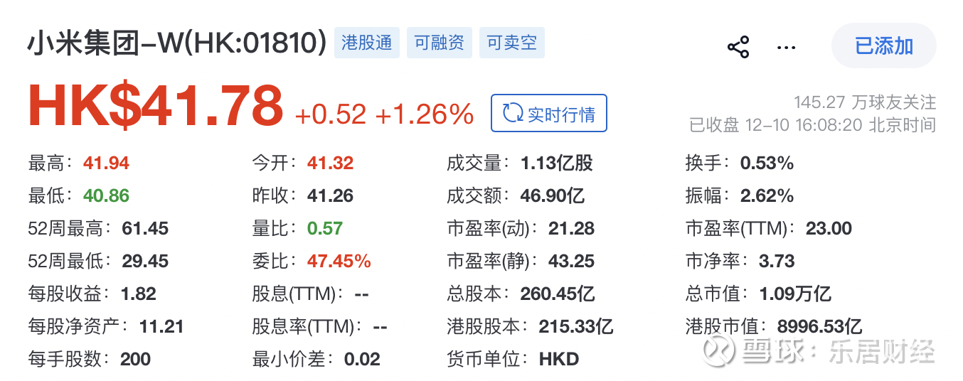 截至当日收盘,小米集团报41.78港元,涨1.26%,总市值约1.09万亿港元。