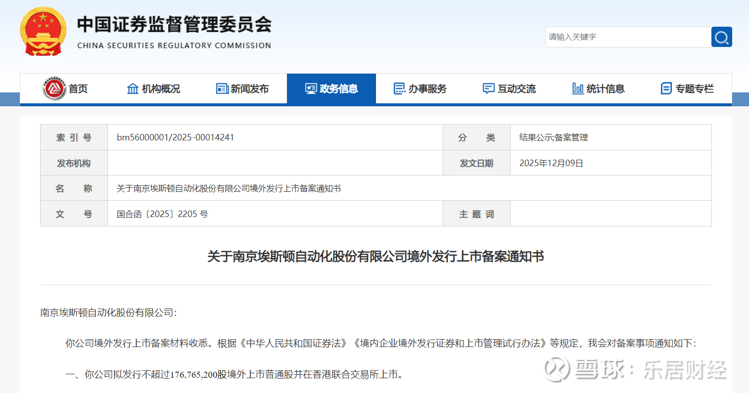 瑞财经 赵盼盼12月9日,中国证监会国际合作司发布关于南京埃斯顿自动化股份有限公司(以下简称“埃斯顿”)境外发行上市备案通知书。