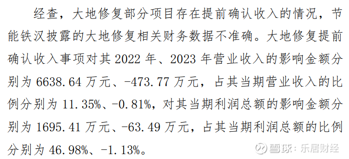 据监管函,2023年12月8日,深交所受理了节能铁汉发行股份购买资产并募集配套资金申请,中节能大地环境修复有限公司为标的公司。经查明,节能铁汉存在违规行为。大地修复部分项目存在提前确认收入情况,其提前确认收入事项对2022年、2023年营业收入的影响金额分别为6638.64万元、 - 473.77万元,占当期营业收入的比例分别为11.35%、 - 0.81%,对当期利润总额的影响金额分别为1695.41万元、 - 63.49万元,占当期利润总额的比例分别为46.98%、 - 1.13%。此外,大地修复2022年和2023年前十大项目之一曾于2022年12月调整项目预算,节能铁汉在问询回复中未完整披露该预算调整情况。