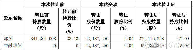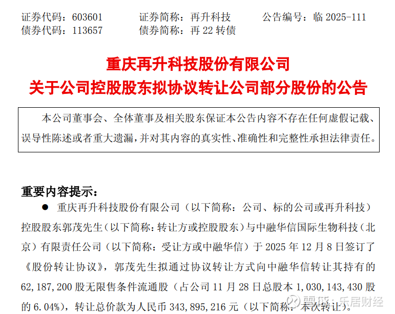 公告显示,重庆再升科技股份有限公司控股股东郭茂与中融华信国际生物科技(北京)有限责任公司于12月8日签订《股份转让协议》,郭茂拟通过协议转让方式向中融华信转让其持有的6218.72万股无限售条件流通股,占公司11月28日总股本10.30亿股的6.04%,转让总价款为3.44亿元(每股转让价格5.53元)。