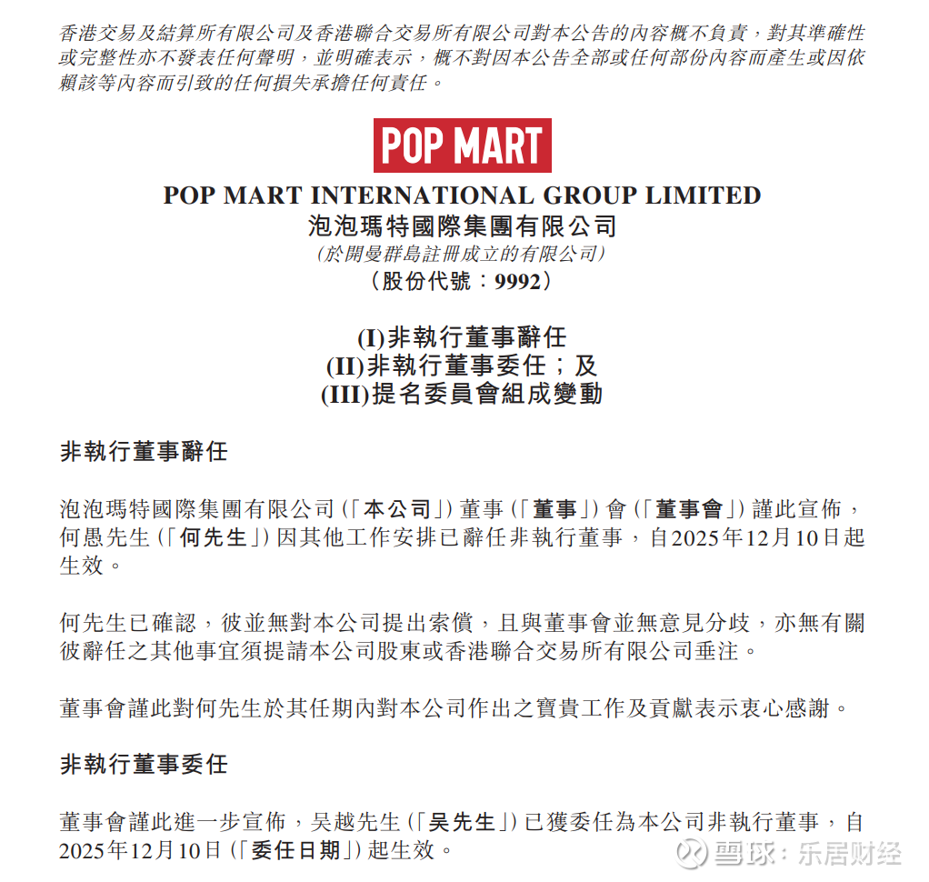瑞财经 赵盼盼 12月10日,泡泡玛特发布公告称,何愚因其他工作安排已辞任非执行董事,同时吴越获委任为公司非执行董事,自2025年12月10日起生效。