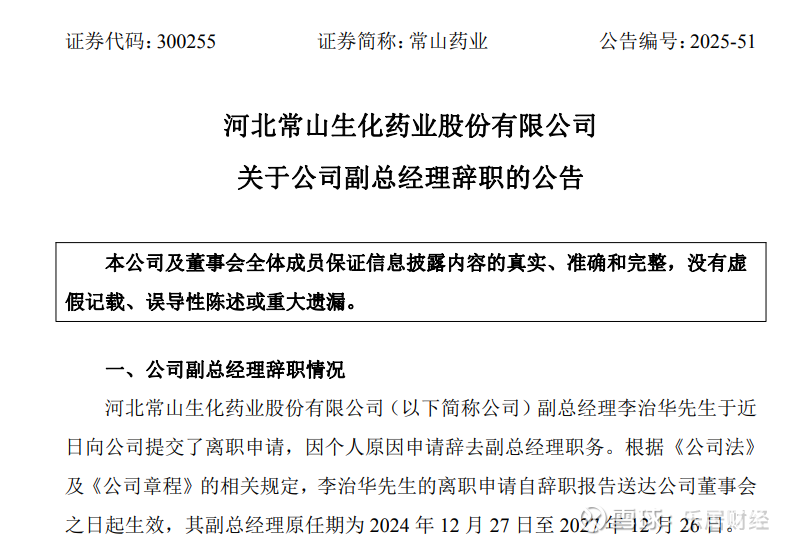 公告显示,河北常山生化药业股份有限公司副总经理李治华近日因个人原因向公司提交离职申请,离职申请自辞职报告送达公司董事会之日起生效。其原副总经理任期为2024年12月27日至2027年12月26日。辞去副总经理职务后,李治华仍在公司担任其他职务。截至公告日,李治华持有公司股票29万股。