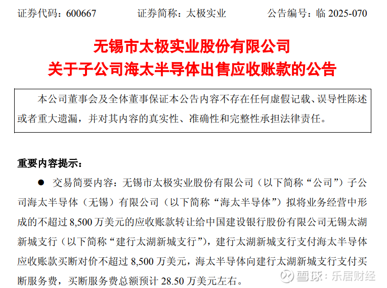 公告显示,无锡市太极实业股份有限公司子公司海太半导体拟将业务经营中形成的不超过8500万美元的应收账款转让给建行太湖新城支行,该账款为海太半导体2025年11月全部、12月部分预计形成的对SK海力士株式会社的应收账款。建行太湖新城支行支付海太半导体应收账款的买断对价不超过8500万美元,海太半导体需向建行太湖新城支行支付买断服务费,经初步测算,买断服务费总额预计28.50万美元左右,最终以实际结算为准。