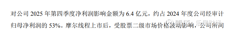 世纪华通表示,以摩尔线程2025年12月10日收盘价为基准初步估算,公司所持份额预计对2025年第四季度净利润影响金额为6.4亿元,约占2024年度公司经审计归母净利润的53%。