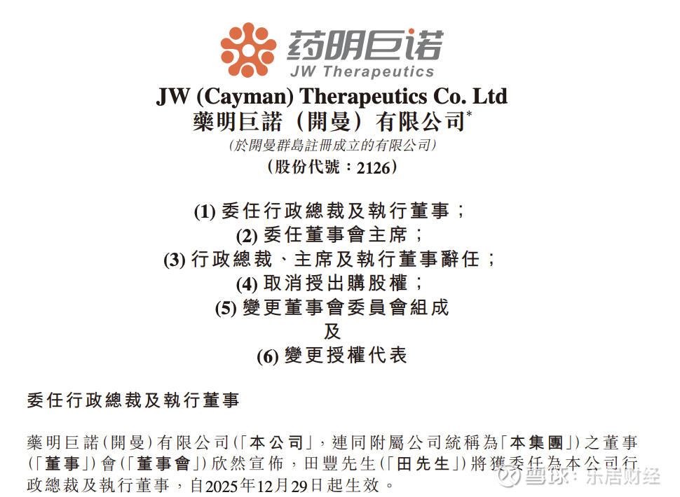 田丰将获委任为公司行政总裁及执行董事,自2025年12月29日起生效。刘诚获委任为董事会主席,自2025年12月12日起生效。委任田丰及刘敏辞任后,田丰将获委任为提名委员会和业务发展及策略委员会成员,自2025年12月29日起生效。