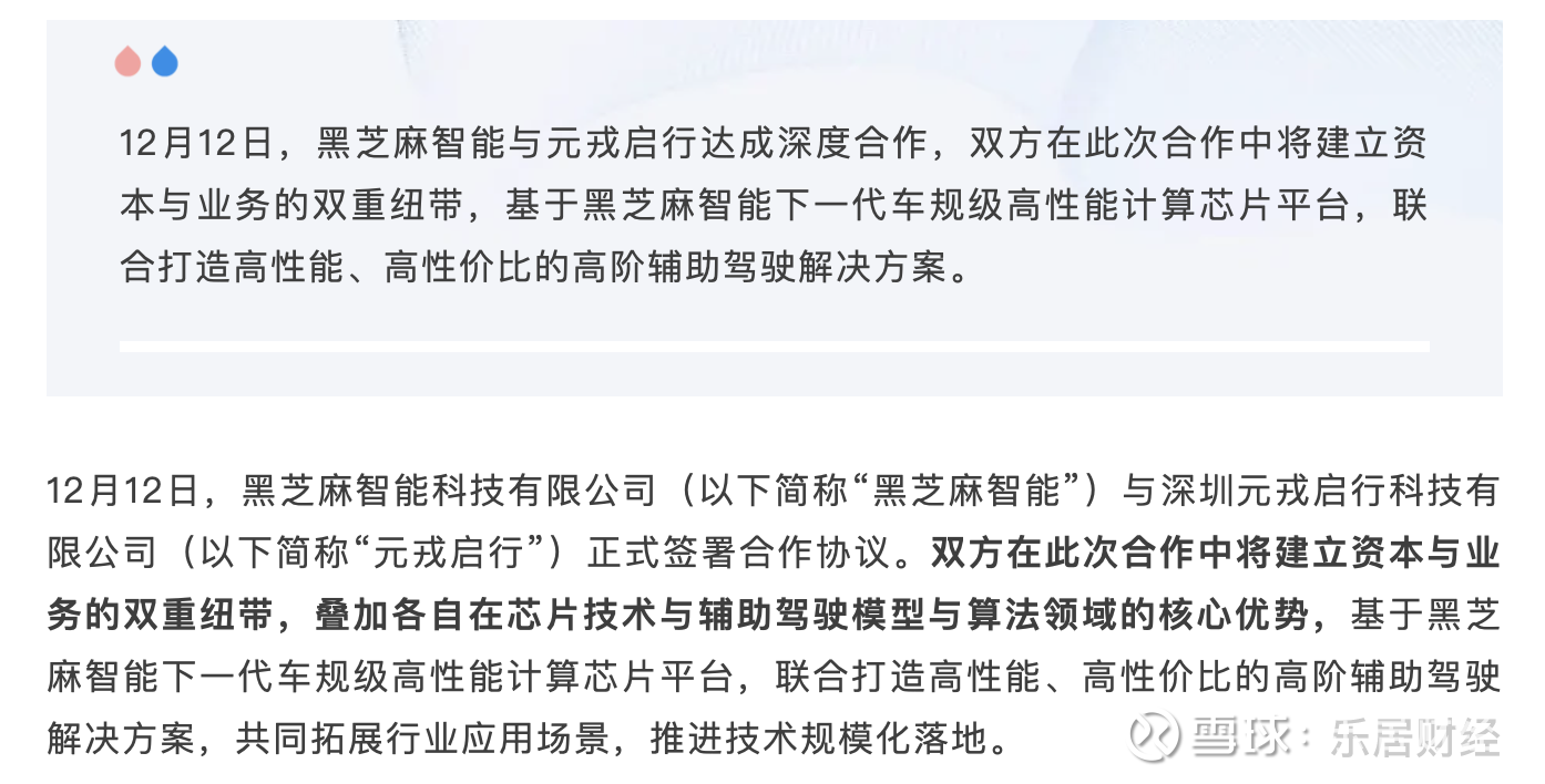 瑞财经 吴文婷 12月12日,黑芝麻智能科技有限公司(以下简称“黑芝麻智能”)与深圳元戎启行科技有限公司(以下简称“元戎启行”)正式签署合作协议。
