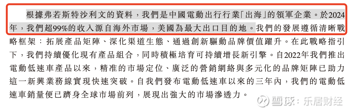 值得一提的是,根据弗若斯特沙利文的资料,涛涛车业是中国电动出行行业“出海”的领军企业。于2024年,公司超99%的收入源自海外市场,美国为最大出口目的地。