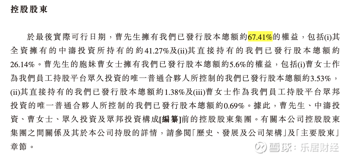 曹马涛的胞妹曹侠淑拥有公司已发行股本总额约5.6%的权益,包括曹侠淑作为员工持股平台众久投资的唯一普通合伙人所控制的公司已发行股本总额约3.53%,其直接持有的公司已发行股本总额约1.38%及曹侠淑作为员工持股平台众邦投资的唯一普通合伙人所控制的公司已发行股本总额约0.69%。