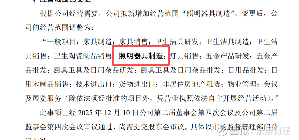 12月10日,朵纳家居(872984.NQ)发布公告,根据公司经营需要,公司拟新增加经营范围“照明器具制造”。