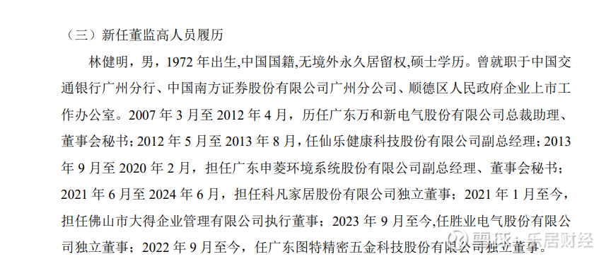 林健明企业经历主要集中于董事会秘书及高管岗位:2007年3月至2012年4月,历任广东万和新电气股份有限公司总裁助理、董事会秘书;2012年5月至2013年8月,任仙乐健康科技股份有限公司副总经理;2013年9月至2020年2月,担任广东申菱环境系统股份有限公司副总经理、董事会秘书;2021年6月至 2024年6月,担任科凡家居股份有限公司独立董事。