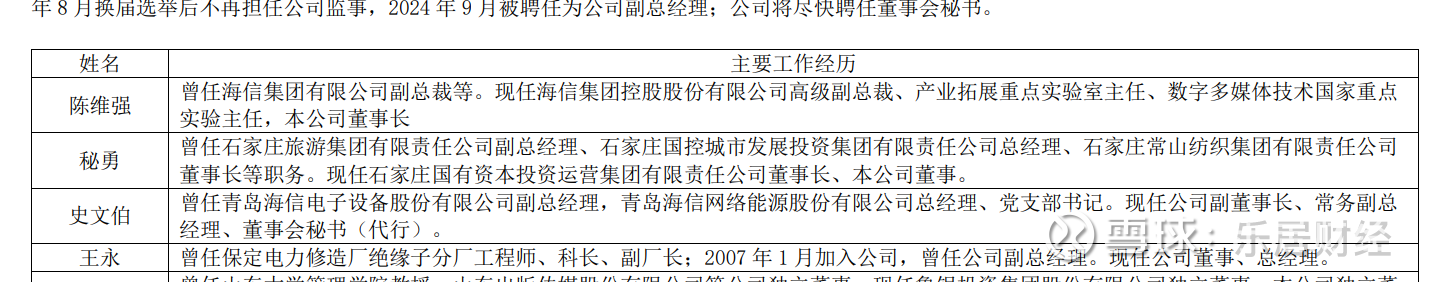 史文伯同样具备海信系背景,曾任青岛海信电子设备股份有限公司副总经理,青岛海信网络能源股份有限公司总经理、党支部书记。现任公司副董事长、常务副总经理、董事会秘书(代行)。