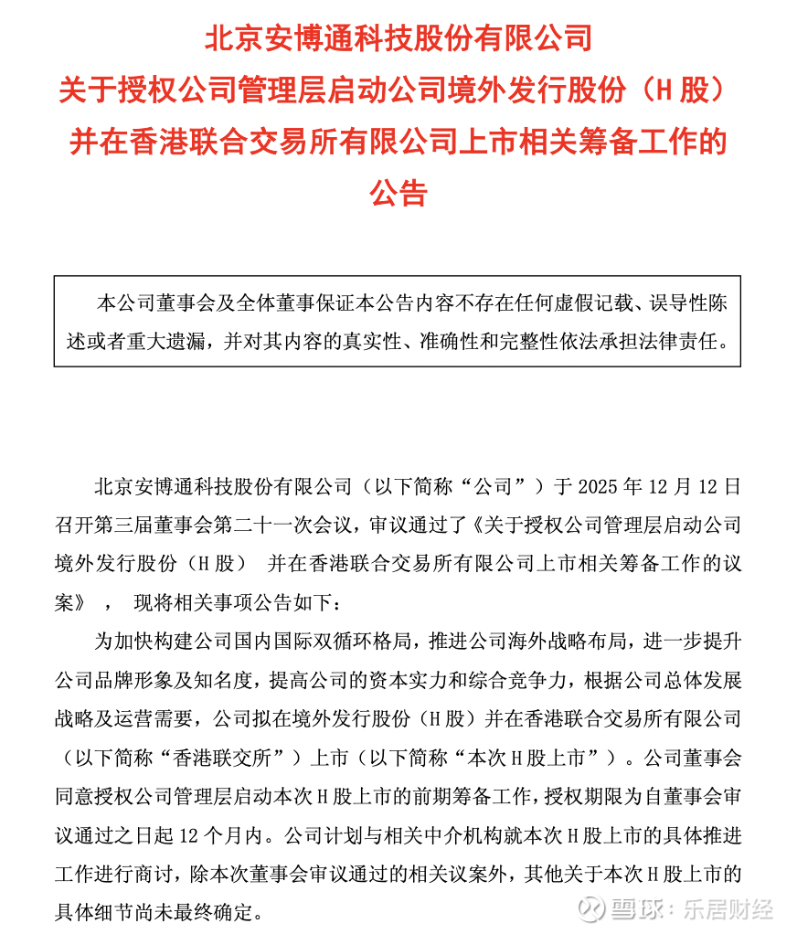 瑞财经 吴文婷12月14日,安博通发布公告称,公司于2025年12月12日召开第三届董事会第二十一次会议,审议通过了《关于授权公司管理层启动公司境外发行股份(H股) 并在香港联合交易所有限公司上市相关筹备工作的议案》。