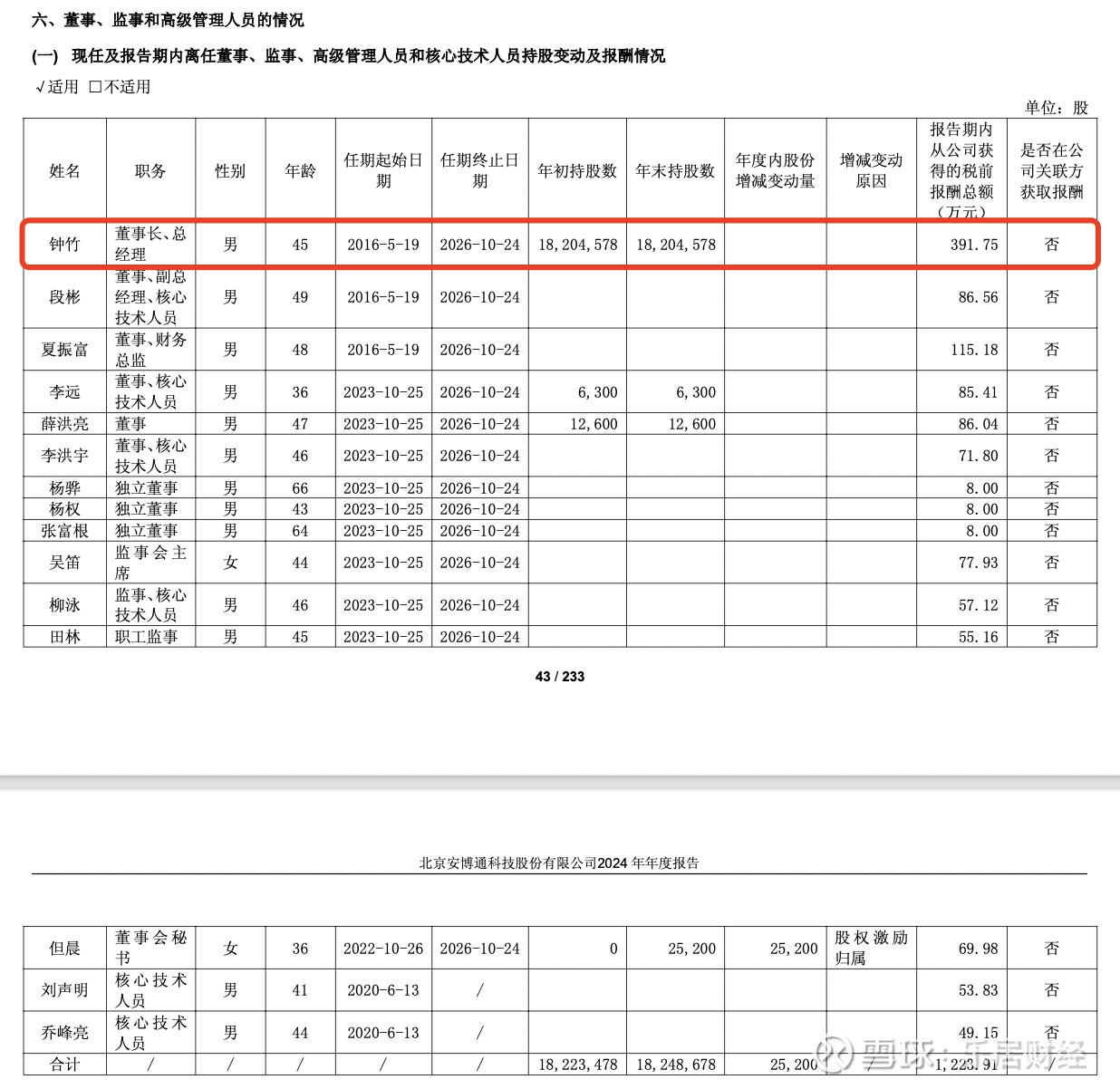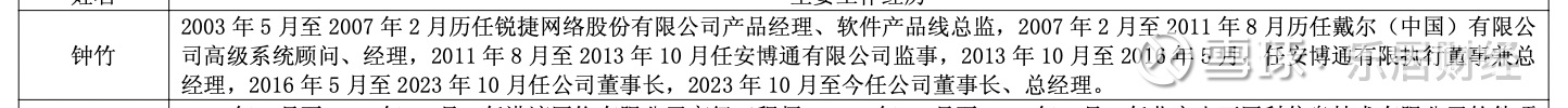 资料显示,钟竹,现年45岁,2003年5月至2007年2月历任锐捷网络股份有限公司产品经理、软件产品线总监,2007年2月至2011年8月历任戴尔(中国)有限公司高级系统顾问、经理,2011年8月至2013年10月任安博通有限公司监事,2013年10月至2016年5月,任安博通有限执行董事兼总经理,2016年5月至2023年10月任公司董事长,2023年10月至今任公司董事长、总经理。