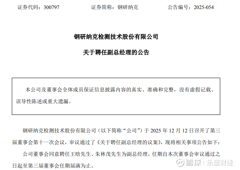 公告显示,钢研纳克检测技术股份有限公司当日召开第三届董事会第十一次会议。会议审议通过《关于聘任副总经理的议案》,董事会同意聘任王晗、朱林茂为副总经理。二人任期自本次董事会审议通过之日起,至第三届董事会任期届满为止。