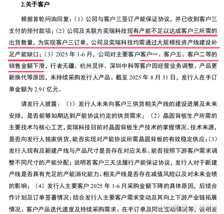 据文件,2025年1-6月,视涯科技对主要客户客户一、客户五、客户二等的销售金额下滑,行者无疆、杭州灵伴、深圳中科等客户因经营业务调整、产品更新换代等原因,未持续采购产品。截至2025年8月31日,公司在手订单金额为2.91亿元。