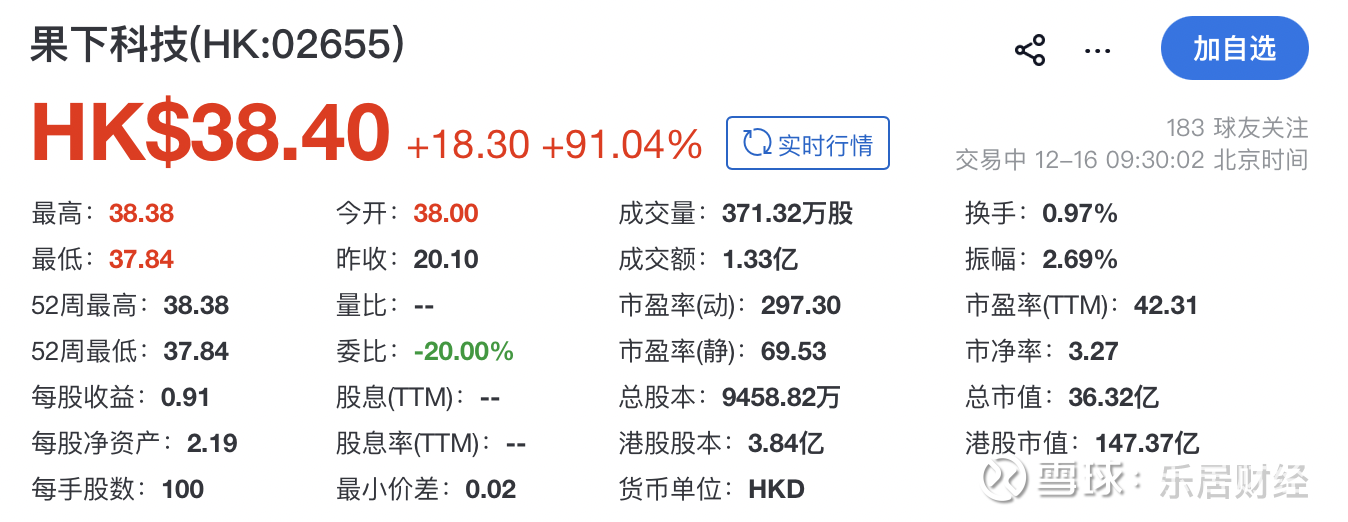 乐居财经 吴文婷 12月16日,果下科技(02655.HK)在港交所挂牌上市,独家保荐人为光大证券国际。其开盘报38.4港元,涨91.04%,总市值约36.32亿港元。